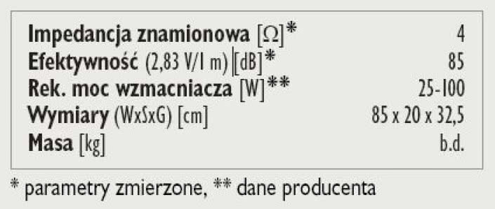 Nie zagrają potężnie, lecz tworzą dźwięk obfity, z dobrą głębią i stabilnymi pozycjami źródeł na pierwszym planie. Nie należy ich doprowadzać do wysokich poziomów wysterowania, bo tracą swoją charyzmę, nikt chyba jednak nie kupuje tak wyglądających kolumn dla obsługi imprez.