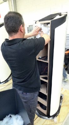 Wkładanie wytłumienia - takie kłaczki można wypruć z poduszek sprzedawanych w IKEA, każdy może mieć więc w swoich kolumnach odrobinę tego, co mają najlepsze Sonusy...