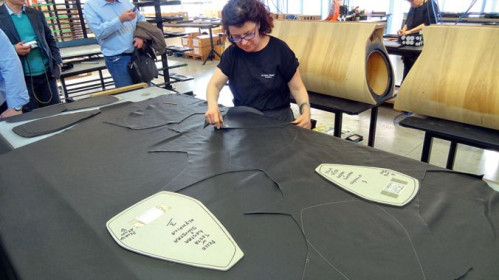 Z wielkiego płata bydlęcej skóry (naturalnej...) są wybierane fragmenty, które będą najlepiej do siebie pasować w ramach jednej pary kolumn (Olympiki mają wykończone skórą górne ścianki). Z tyłu widać surowe obudowy do Aidy.