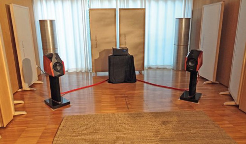 Dłużej przyglądać się też nie mogłem, bo za chwilę narzucili na kolumny wielkie worki, ujrzałem jednak coś, wielkie coś, na kształt i skalę modelu Aida, z wklęsłymi przednimi fragmentami boków, z otworem bas-refl eks w formie wielkiej szczeliny pod górną ścianką, promieniującej do tyłu, częściowo w kolorze Ferrari Red. Gdybym wtedy wiedział, że za chwilę to zasłonią, to bym się bardziej skupił na tym obiekcie i zapamiętał więcej szczegółów. Wiadomo więc tyle, że w Sonusie nie spoczywają na laurach, projektują nowe konstrukcje, i to takie, które mają nam po raz kolejny zapierać dech w piersiach.