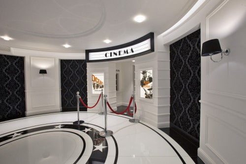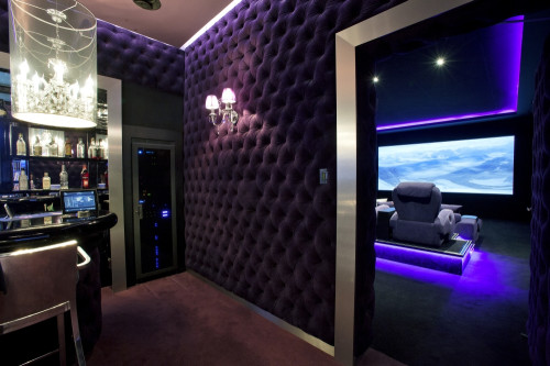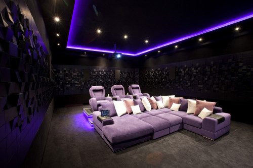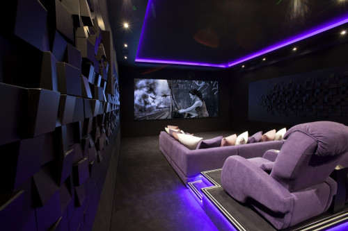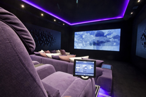 Wreszcie – część najważniejsza, do której prowadzą wyciszone drzwi. Tak jak wymagał tego inwestor, w pomieszczeniu wyeliminowano wszelkie akustyczne niedoskonałości przy pomocy pochłaniających paneli akustycznych. W rogach umieszczono pułapki basowe, zaś podłogę pokryto specjalnym materiałem. Zastosowanie systemu Crestron pozwala na integrację z pozostałymi częściami domu i z kina można sterować oświetleniem, systemami bezpieczeństwa, zarządzania energią i monitoringu – wszystko sterowane ze zindywidualizowanego interfejsu użytkownika.