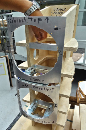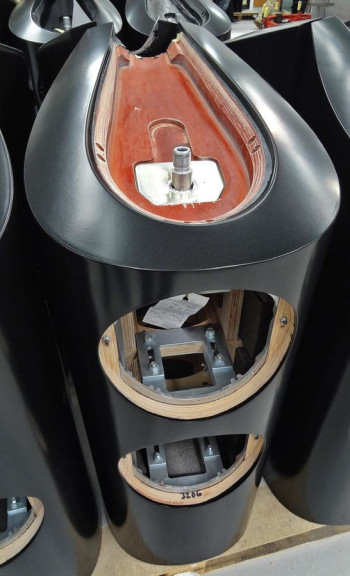 (Prawie) wszystko, co ważne w nowym projekcie obudów dla modeli 803, 802 i 800 widać na tym zdjęciu. Wewnątrz obudowy, w jej przedniej części, umieszczono (przykręcony do głębiej ulokowanych wzmocnień ze sklejki) metalowy szkielet, do którego są mocowane głośniki. Zewnętrzny kształt obudowy jest określony przez wygięcie jednego płata sklejki, tworzącego front i boki, oraz wyprofilowanie górnej ścianki.