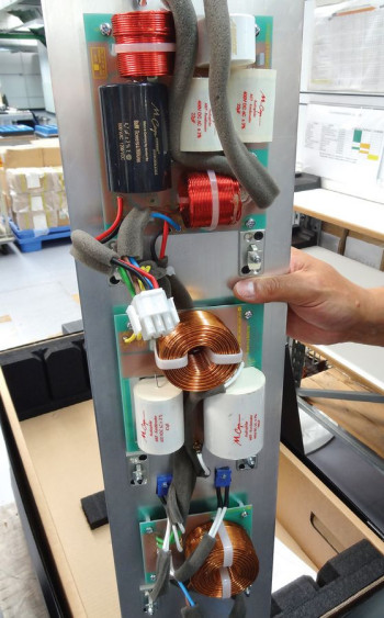 Zwrotnica modelu 802 D3, podzielona na trzy płytki (górna to filtry średniotonowego i wysokotonowego, środkowa i dolna to filtr sekcji niskotonowej), jest przykręcona do aluminiowego panelu - tylnej ścianki obudowy, oczywiście od wewnętrznej strony. Wyłącznie cewki powietrzne, wyłącznie kondensatory polipropylenowe, a niektóre z nich bardzo kosztowne.
