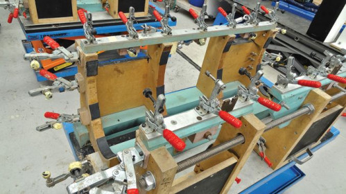 Obudowy 805 D3 są sklejane w stworzonych specjalnie dla nich "klatkach". "Do not adjust pushing feet" - w wolnym tłumaczeniu: "Nie dopychać nogami".