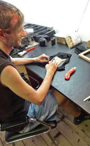Nawet wykonywanie prozaicznych maskownic, czyli rozpinanie czarnej tkaniny na cienkiej ramce z MDF-u, nie może zostać w łatwy sposób zautomatyzowane - znowu ręczna robota okazuje się optymalna.