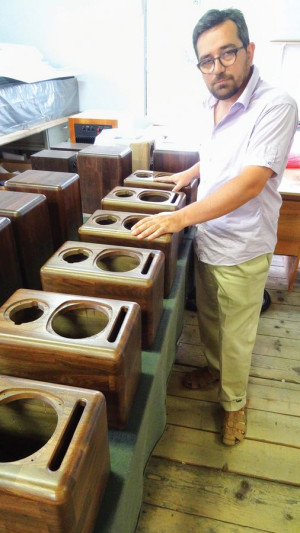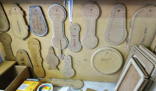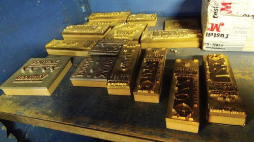 "Stemple" służące do wyciskania w drewnie firmowego logo, nazwy modelu i numeru seryjnego - składanego jak w tradycyjnej drukarni.