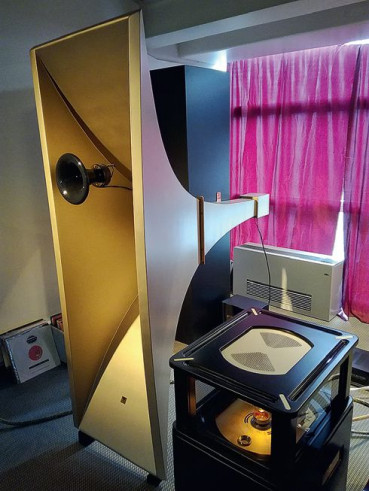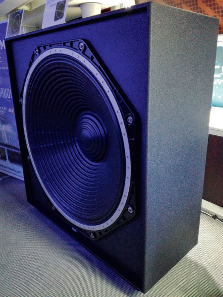 50-calowy przetwornik Ascendo. Tak, 50-calowy, nie 50-centymetrowy. Czyli metr dwadzieścia pięć. I nie jest to makieta, ale działające ustrojstwo. "Obudowa" jest potrzebna tylko do zainstalowania głośnika, przy tak wielkiej średnicy i szerokości frontu, nawet przy otwartej odgrodzie, charakterystyka będzie sięgać bardzo nisko.