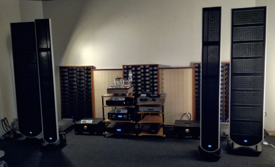 Kolumny Goebel Epoque Reference z subwooferami Baforce Petite active i elektroniką CH Precision. Do tego jeszcze kondycjoner Gigawatta.