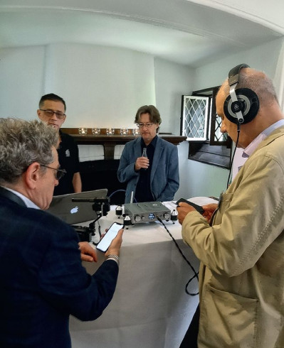 Nawet zdeklarowani zwolennicy analogu i?poważnych systemów stereo muszą dzisiaj pochylić głowę przed plikami i słuchawkami... Tyłem stoją Michael Fremer (Stereophile) i Matthias Bode (Stereo).