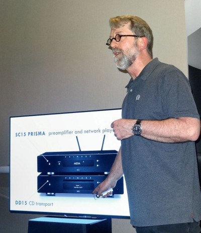 Już w Monachium można było zobaczyć nowe urządzenia Primare, w Antwerpii położono nacisk na dwie konstrukcje "trzy czwarte" (75% szerokości klasycznych komponentów): odtwarzacz strumieniowy SC15 i transport DD15. Pierwszy ma też podstawową funkcjonalność przedwzmacniacza, może więc przyjmować sygnały nie tylko ze źródeł cyfrowych, ale i analogowych, oraz regulować poziom na wyjściu (analogowym). Jest też (nad)kompletny odtwarzacz CD15, który ma oczywiście wbudowany przetwornik C/A, wyjścia analogowe, a także wejścia cyfrowe i odtwarzacz plików – nie ma jednak wejść analogowych, więc nie łączy wszystkich cech SC15 i DD15, co przecież nie miałoby marketingowego sensu. Wzmacniaczem serii jest I15, w wersji Prisma wzbogacony o funkcje sieciowe. Nowoczesnością i?nieprzemijającą trójnożną elegancją Primare inspirował nas Terry Medalen, dyrektor sprzedaży.