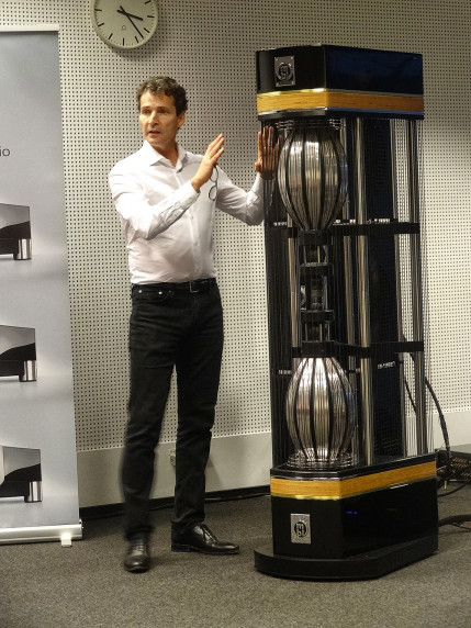 Przedstawiciel MBL-a Juergen Reis objaśnił konstrukcję i specyfikę działania 101 X-treme. Widoczna na zdjęciu część systemu (subwoofer stoi z tyłu, poza kadrem) jest trójdrożna, składa się z pary "cebul" dużych, pary małych, i pary malutkich (w centrum), tworzących układ symetryczny, o promieniowaniu dookólnym. Gra to fantastycznie normalnie. Gładko, przejrzyście, nienerwowo.