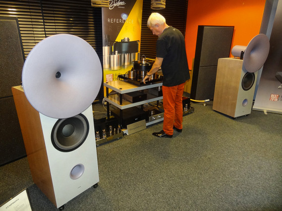 Kolumny firmy Destination Audio, model Nika - z 40-cm niskotonowym, tubą średniotonową (większa na górze) i wysokotonową (mniejsza poniżej). Z efektywnością 99 dB wychodzą naprzeciw potrzebom wzmacniaczy o niskiej mocy, tutaj z monoblokami Jadis SE845 (Single Ended, 20 W).