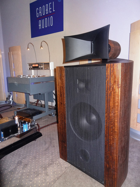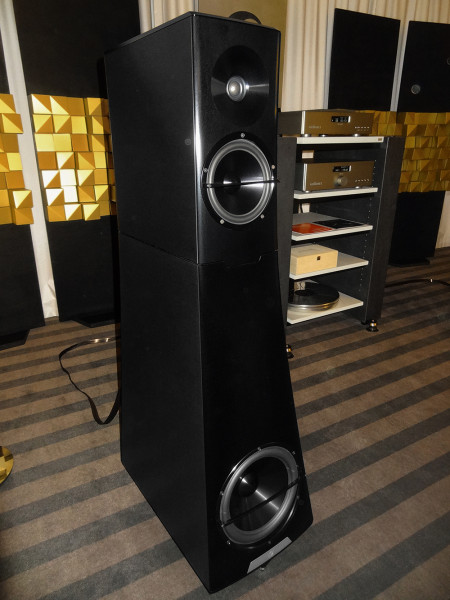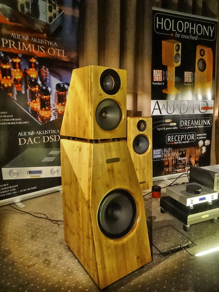 Nowa wersja Holophony Numer Dwa. Dźwięk piękny i charakterystyczny; mocna barwa, faktura lekko chropawa, środek bardzo bliski, góra dobrze wkomponowana, bas gęsty i konturowy, całość bardzo spójna. O tajnikach konstrukcji producent napisał dużo w przewodniku wystawy, m.in. pochwalił się (albo poskarżył), że przetestował kilka tysięcy zwrotnic. W takim razie współczuję i jestem rozczarowany. Zwykle tak dobry efekt uzyskuję po przetestowaniu kilkudziesięciu.