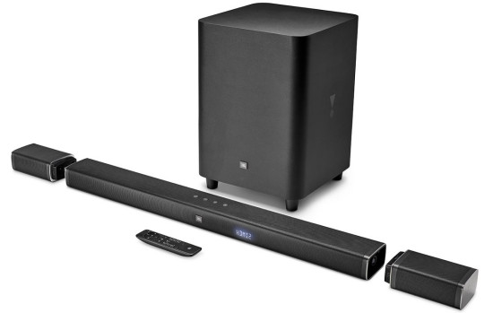 Soundbar JBL Bar 5.1 można wykorzystać do stworzenia bezprzewodowego 5.1-kanałowego kina domowego. Urządzenie jest wyposażone w dwa odłączane bezprzewodowe głośniki przestrzenne działające przez 10 godzin na jednym ładowaniu akumulatora, 10-calowy (250 mm) subwoofer oraz trzy wejścia HDMI z HDCP 2.2 do podłączania urządzeń 4K oraz Bluetooth.