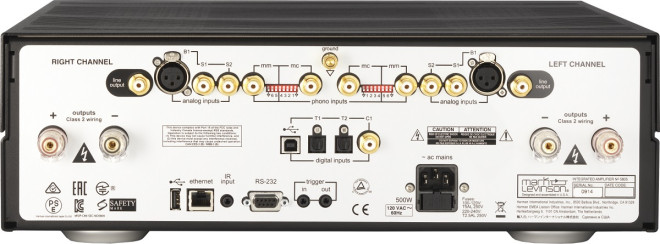 Anodowane na czarno panele przednie wykrojone z litego aluminium o grubości 25 mm, przechodzą niezauważalnie w elegancką szklaną powierzchnię zintegrowaną z wyświetlaczem, zamkniętą od góry i dołu dwoma poprzeczkami o naturalnej aluminiowej barwie. Fot. Mark Levinson No 5802