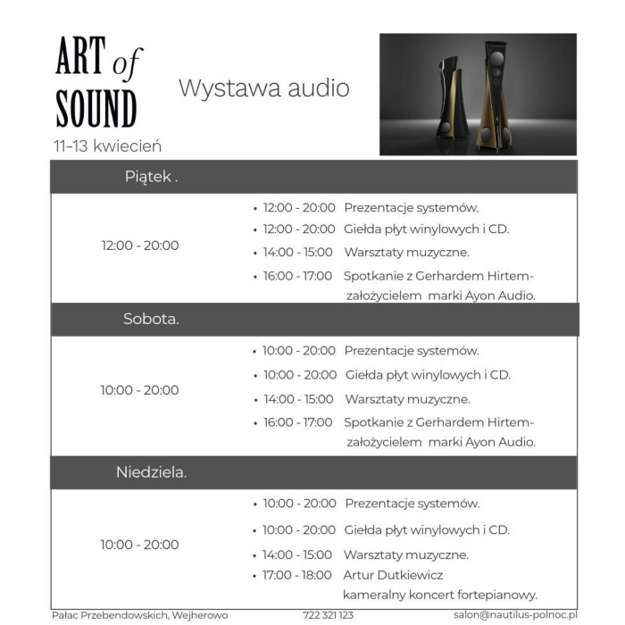 Odwiedzający wystawę będą mogli posłuchać unikalnych systemów audio zbudowanych ze światowej klasy komponentów hi end, dowiedzieć się jak zbudować system do własnego domu, zgłębić swoje dotychczasowe doświadczenie bądź rozpocząć swoją przygodę w świecie audio. W programie są także spotkania z założycielem marki Ayon Audio Gerhardem Hirtem oraz koncert fortepianowy Artura Dutkiewicza.