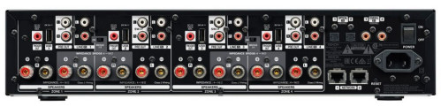 - Dedykowane wyjście przedwzmacniacza dla każdej strefy (wybieralne jako strefa stereo lub wyjście subwoofera)