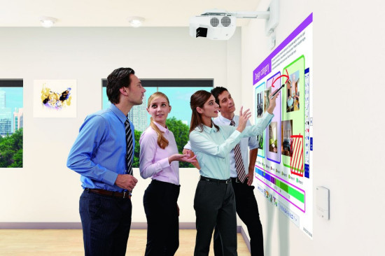 Epson EB-1460Ui przydaje się również w pomieszczeniach konferencyjnych dzięki obsłudze głosu i obrazu w usłudze Skype i wielu innych funkcji interaktywnych. Zdalna obsługa pomaga ograniczyć koszty podróży, a funkcja zdalnego pulpitu oferuje swobodę i elastyczność, ponieważ po odejściu od komputera prezentację można z dowolnego miejsca w biurze.