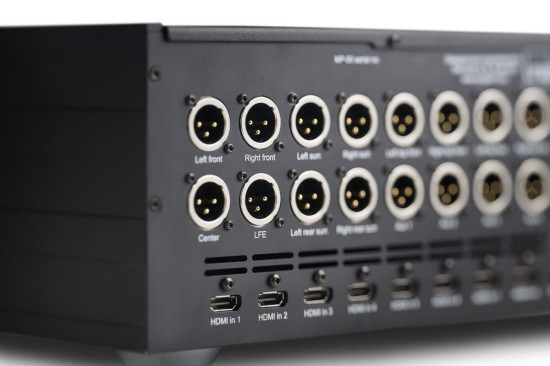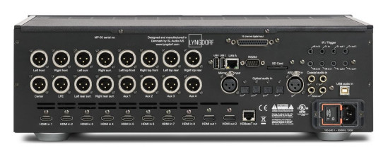 Lyngdorf MP-50 dysponuje ponadto 16 zbalansowanymi wyjściami w standardzie XLR i może wysyłać sygnał do 12 zewnętrznych końcówek mocy. Pozostałe 4 wyjścia mogą być wykorzystane dla dodatkowych głośników lub głośników niskotonowych.
