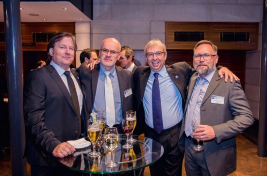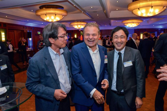 Przedstawiciel Denona, Yoshinari Fukushima (nagroda za słuchawki AH-D7200), w towarzystwie (od lewej) Paula Millera, Jammie Biesemanna (szef grupy ekspertów Hi-Fi) i Ljuby Miodragovica (wiceprezydent).