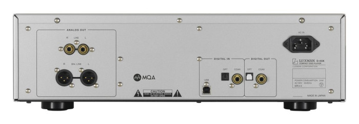 Luxman D-03X jest kompatybilny z materiałami PCM w rozdzielczości 32 bitów i częstotliwości próbkowania 384 kHz, a także z zapisem DSD128 (w przypadku wejścia USB; pozostałe złącza, optyczne i współosiowe, ograniczono do PCM 24/192).