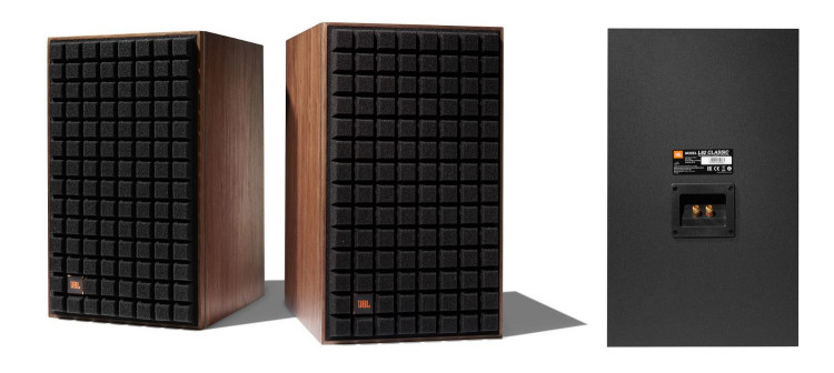 Obudowa kolumn JBL L82 Classic jest wykonana z forniru z drewna orzechowego, maskownica z pianki Quadrex ma zaś trzy kolory - czarny, pomarańczowy i niebieski.