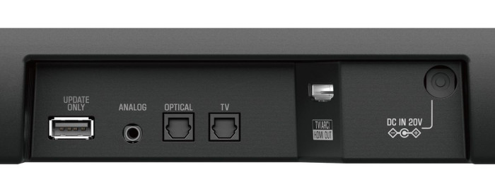 Obudowa soundbara skrywa też dwa subwoofery (75 mm) współpracujące z dwoma portami bas-refleks, parę przetworników niskotonowych (55 mm) oraz dwa głośniki wysokotonowe (25 mm).
