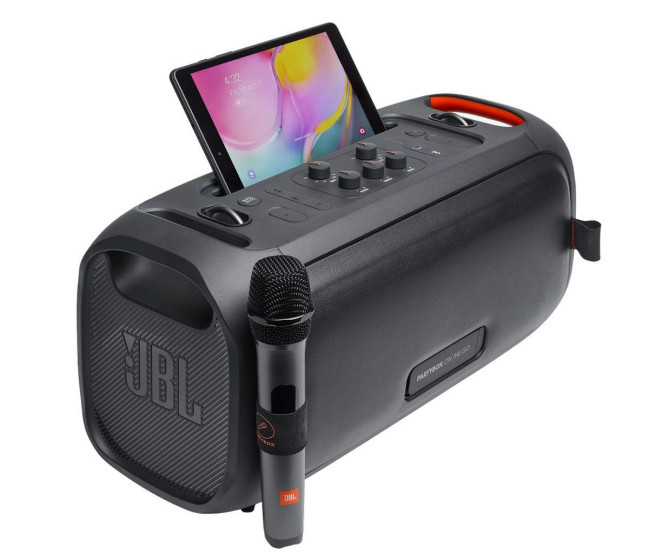 Głośnik ma też do zaoferowania zsynchronizowany, dynamiczny pokaz świetlny. Aby go uaktywnić, możemy użyć różnych zaprogramowanych wzorów. W zestawie znajduje się ponadto bezprzewodowy mikrofon JBL o zasięgu do 10 metrów.
