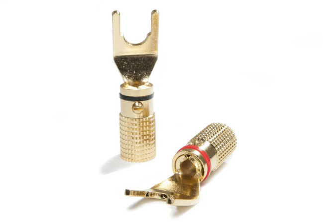 Widły do montażu na kabel głośnikowy o przekroju do 4 mm². Wykonany w całości z metalu, zabezpieczony przed korozją pozłacaniem. Łatwy montaż na 2 śruby zabezpiecza go przed jakimkolwiek ruchem, a przy tym nie wymaga lutowania.