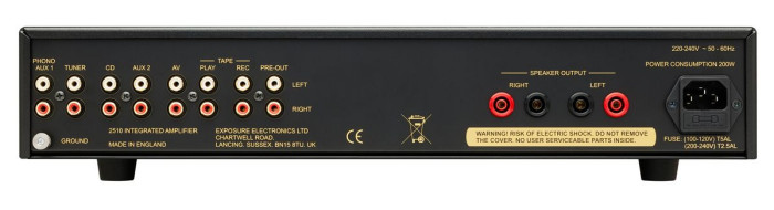 Exposure 2510 oferuje pięć wejść liniowych i przedwzmacniacz gramofonowy MM zamontowany w standardzie, wyjście liniowe (tworzące pętlę magnetofonową) i jedno wyjście pre-out. Komplet wpuszczanych zacisków głośnikowych, jako rozwiązanie typowo brytyjskie, zezwala tylko na użycie bananów.