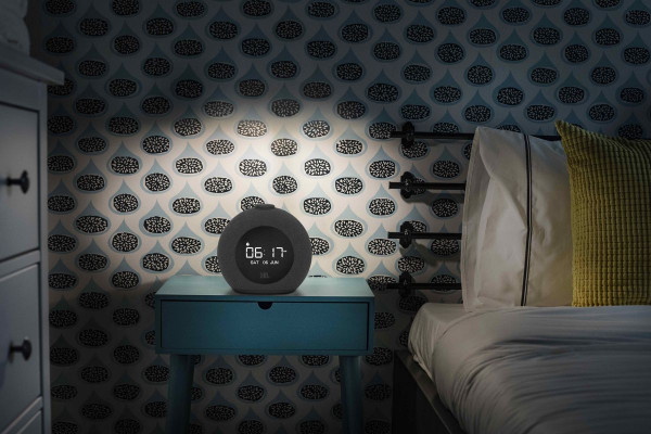Głośnik może także służyć jako dodatkowe subtelne oświetlenie, np. w sypialni. Wbudowany czujnik automatycznie dostosowuje przy tym jasność wyświetlacza do oświetlenia w pomieszczeniu. Wyświetlacz pokazuje zaś ustawienia alarmu, a także aktualny czas czy informacje o odtwarzanej stacji radiowej.