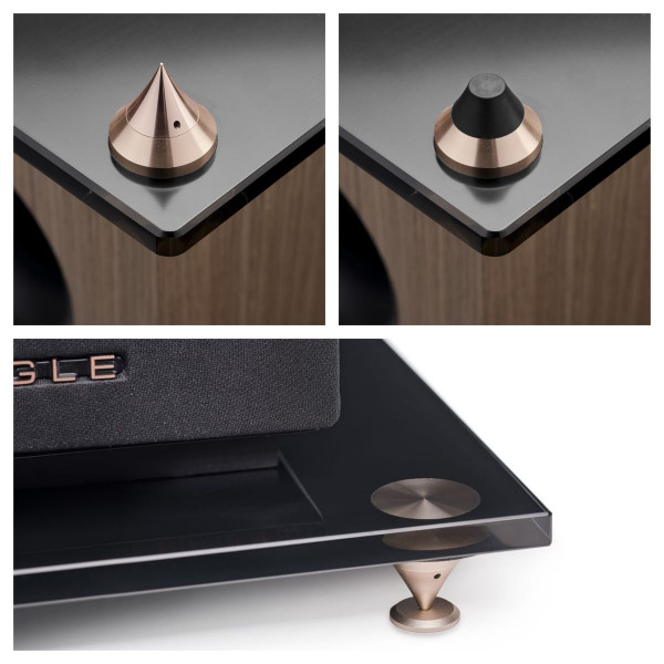 Producent zadbał przy tym o detale. Wśród akcesoriów, jakie dołączył do kolumn, znajdziemy np. dwa zestawy kolców odsprzęgających - jeden (w kolorze różowego złota) przeznaczony do delikatnych powierzchni jak dywan, a drugi - gumowy do twardych, gładkich podłóg.
