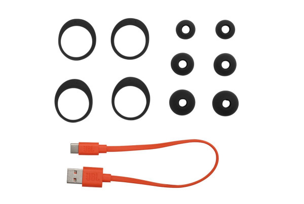Wraz ze słuchawkami JBL Live Free NC+ TWS otrzymujemy końcówki douszne w 3 rozmiarach i nakładki żelowe w 2 rozmiarach.