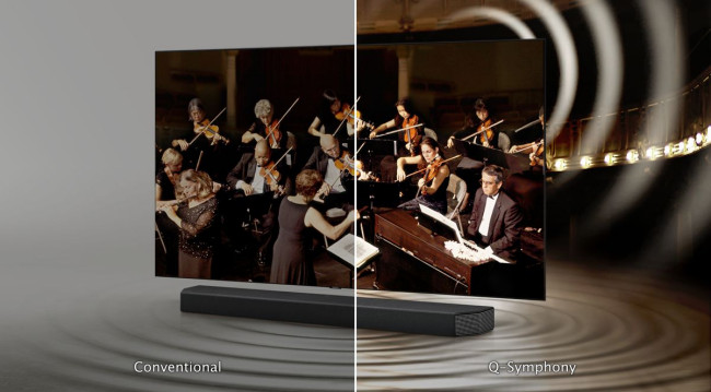 Soundbary Samsung Q-Serii współpracują z telewizorami. W tym roku wszystkie modele Neo QLED, QLED oraz Crystal UHD (od modelu AU7000 i wyższe) oferują funkcje Q-Symphony, która synchronizuje głośniki telewizora z soundbarem, co wzmacnia dźwięk płynący z obu urządzeń.
