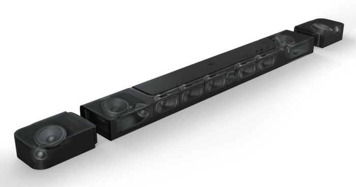 • Soundbar: 5 x (46x90) mm przetworniki typu racetrack, 3 x 0,75” (20 mm) głośniki wysokotonowe, 2 x 2,75” (70 mm) przetworniki skierowane w górę