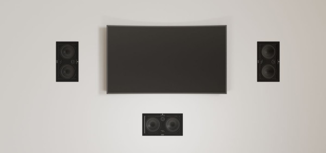 Dwa głośniki instalacyjne LCR7 ustawione w pionie dla kanałów przednich i 1 głośnik poziomo dla kanału centralnego. Dodatkowo subwoofer, taki jak TALES 340, aby wspierał niskie częstotliwości.
