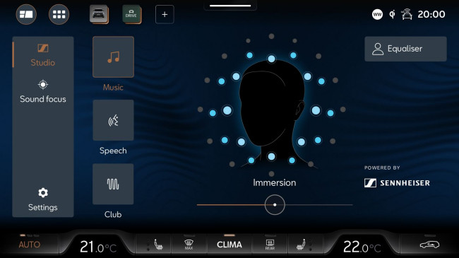 CUPRA Tavascan otrzymał wysokiej jakości 12-głośnikowy system audio, Sennheiser zaproponował funkcję AMBEO Concerto, swoją najnowszą innowację w zakresie oprogramowania zapewniającego wciągający dźwięk.