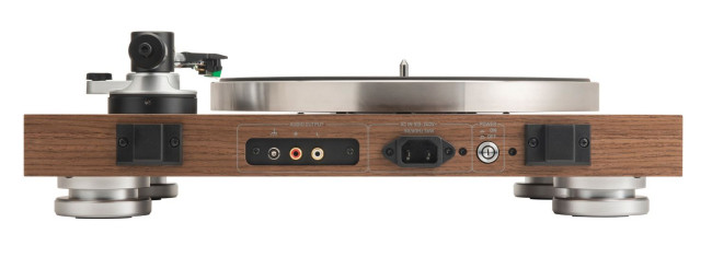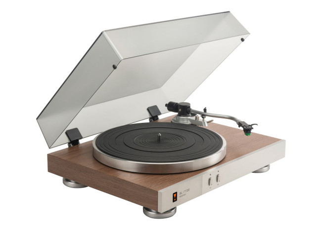 Gramofon JBL TT350 Classic otrzymał solidny cokół z fornirem z drewna orzecha włoskiego, ciężki aluminiowy talerz i aluminiowe ramię w kształcie litery S.