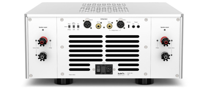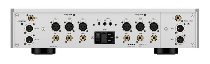 Matrix Audio MP-1 to konstrukcja dual-mono również pod względem fizycznym – oba kanały umieszczono w osobnych częściach obudowy dla zapewnienia pełnej separacji elektromagnetycznej między nimi. Co więcej, urządzenie to posiada zdublowane wyjścia XLR, dzięki czemu możemy podłączyć do niego aż 4 monofoniczne końcówki mocy.