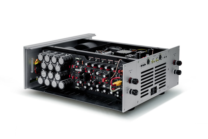 W zasilaniu dla każdego kanału pracuje 14 połączonych równolegle kondensatorów renomowanej marki Nichicon o pojemności 6800 µF każdy, co daje sumaryczną pojemność osiągającą 190,000µF. A jednocześnie poprzez równoległe połączenie zapewnia o wiele niższą rezystancję szeregową sekcji filtrującej zasilacza, a co za tym idzie o wiele lepszą jego odpowiedź na zapotrzebowanie w trakcie impulsów w muzyce.