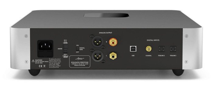 Fezz Audio Equinox Prestige został wyposażony w dwa wejścia Toslink, jedno koncentryczne, a także jedno USB typu B. Za wyjścia mogą nam posłużyć gniazda RCA lub symetryczne XLR.