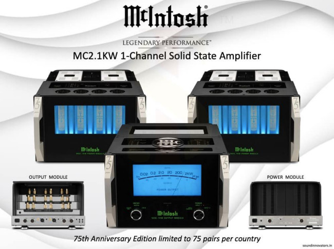10. Najnowsze topowe monobloki McIntosha Mc2.1KW Anniversary. Mc2.1KW to produkt rocznicowy, przygotowany celem uczczenia 75-lecia firmy. Każdy z monobloków składa się z 3 osobnych urządzeń - dwóch zasilaczy oraz modułu wzmacniacza. Ta niesamowita modułowa konstrukcja waży ponad 180 kg i jest w stanie oddać ponad 2000 W mocy ciągłej. Oczywiście, do systemu stereo są potrzebne dwa takie komplety, czyli 6 osobnych urządzeń! Prezentację uzupełni referencyjny przedwzmacniacz C12000 Anniversary, odtwarzacz CD/SACD MCD12000 Anniversary oraz głośniki Rockport Technologies Orion.