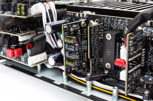 Dbałość o szczegóły i przemyślane podejście do wewnętrznej konstrukcji można również dostrzec we wszystkim, od czterowarstwowych płytek drukowanych po zastrzeżony system ochrony CAP, który wykorzystuje cztery różne metody wykrywania potencjalnych problemów, takich jak przeciążenia zasilania i temperatury, oraz podejmowania działań zapobiegawczych. Również uziemienie zostało starannie przemyślane na każdym etapie. Moc wyjściowa to 100 W na kanał w klasie AB.