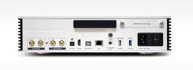 Gniazdo na dysk SSD zapewnia przestrzeń na prywatną kolekcję plików cyfrowych. Tylny panel wzbogacono o złącze HDMI ARC, umożliwiające lepszą kompatybilność z telewizorami oraz prostszą integrację z kinem domowym przy zachowaniu najwyższej jakości dźwięku.