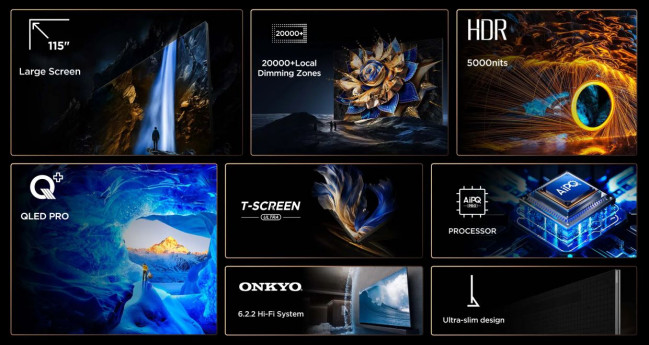 TCL tworzy coraz większe ekrany. Wykorzystując mocne strony TCL CSOT, 115X955 Max staje się największym na świecie telewizorem QD-Mini LED. Został wyposażony w ponad 20 000 lokalnych stref wygaszania i szczytową jasność 5000 nitów. Został zbudowany w oparciu o zaawansowane procesy produkcyjne paneli wyświetlaczy 11. generacji i technologię kolorów QLED.