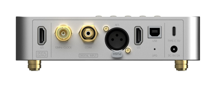 Połączenia obejmują USB-B, AES/EBU, I2S i koncentryczne, a także galwanicznie izolowane wyjście I2S.