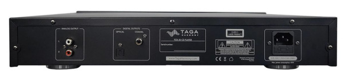Taga Harmony TCD-30 oferuje wyjścia cyfrowe i analogowe. Dostępne są również wyjście analogowe niezbalansowane (RCA), dwa wyjścia cyfrowe (optyczne i koaksjalne), wyjście słuchawkowe wyposażone w regulację głośności. Taga wykorzystała pozłacane gniazda RCA z obrabianego maszynowo mosiądzu.