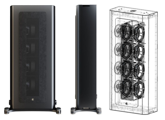 Obudowa o wymiarach 113,8 × 50,8 × 23,9 cm i wadze ponad 100 kg mieści osiem ośmiocalowych przetworników z membranami z włókna węglowego. Pracują one w układzie push-pull, który - jak mówi producent - "skutecznie eliminuje zniekształcenia i wibracje, zapewniając szybki, punktowy i głęboki bas nawet przy ekstremalnych poziomach głośności".