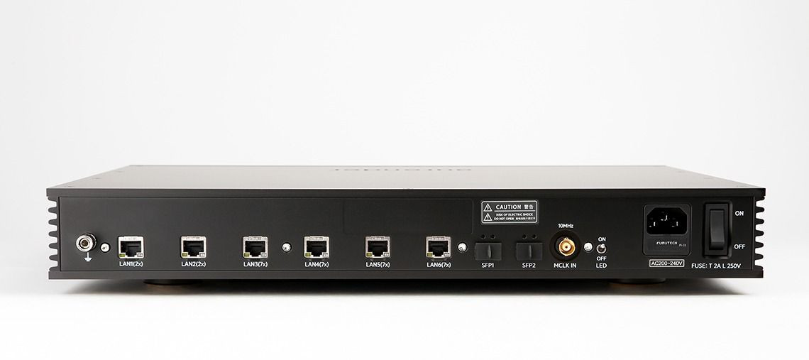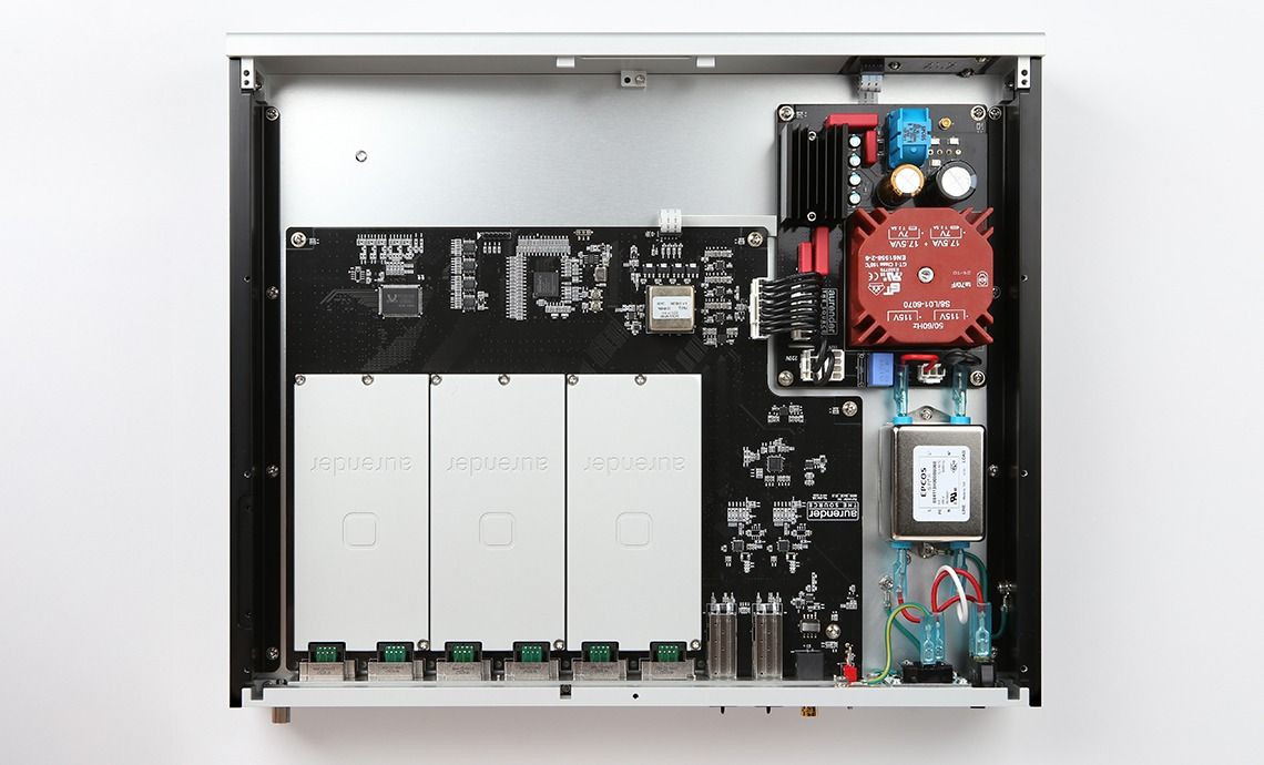 Aurender opracował od zera cały układ elektroniki. Znajdziemy tu 7-krotne filtry przeciwzakłóceniowe zastosowane w 4 gniazdach, które zaprojektowano po raz pierwszy na potrzeby flagowego serwera muzycznego N50. Pozostałe 2 porty RJ45 mają podwójną izolację, a dodatkowe 2 gniazda optyczne umożliwiają łączenie kilku switchy w stos.