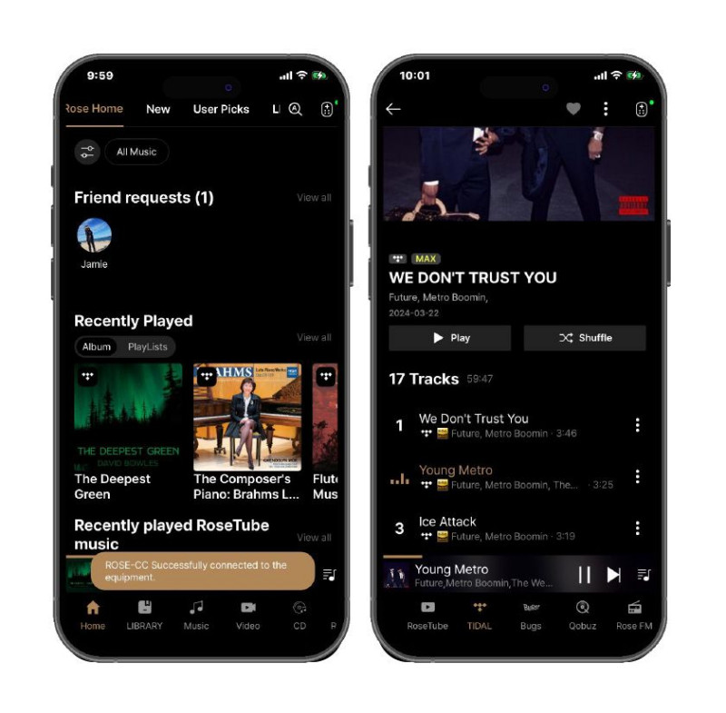 Jednym z kluczowych elementów ROSE ONE jest pełna integracja różnych źródeł muzyki w jednym środowisku. Aplikacja łączy serwisy streamingowe, takie jak TIDAL czy Qobuz, z lokalną biblioteką użytkownika oraz dodatkowymi treściami wideo.
